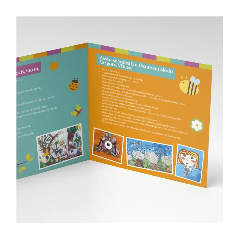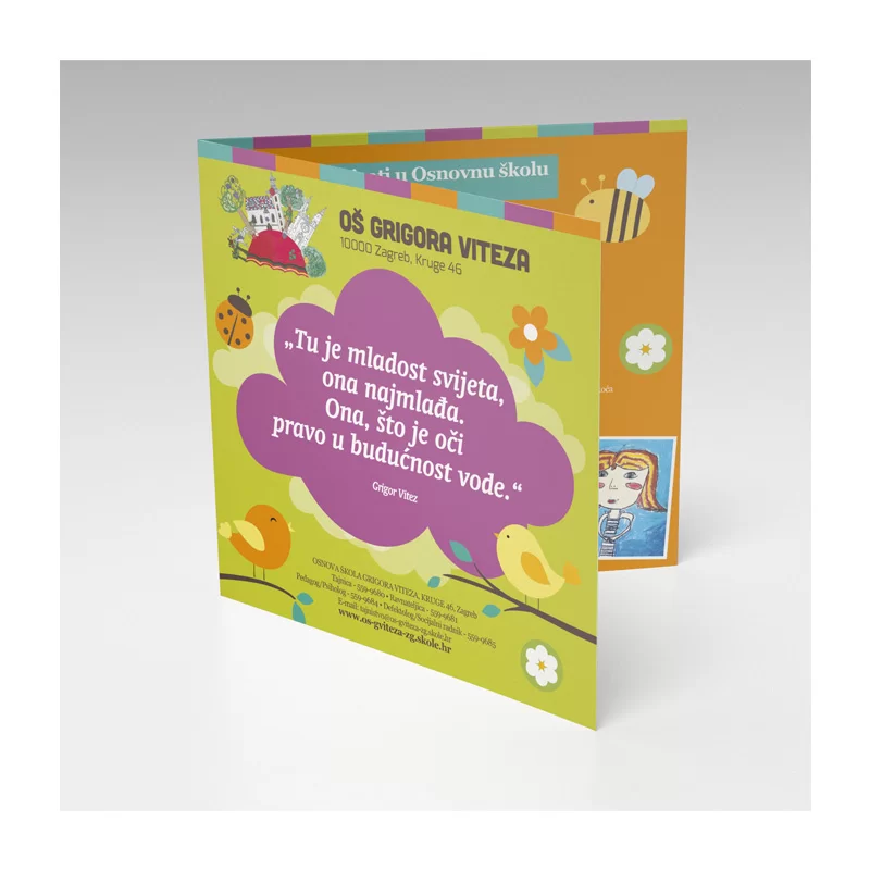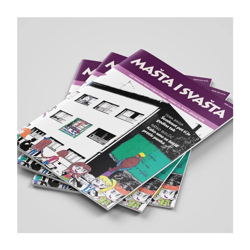 Za OŠ Grigora Viteza niz godina pomažemo u izradi školskog časopisa (nagledamo se i pročitamo puno prekrasnih dječjih radova, i uvijek žalimo što časopis ne može imati barem 100 stranica da ih nekako sve uguramo u njega), radili smo i prigodne promo materijale, roll-upove, omote za CD…