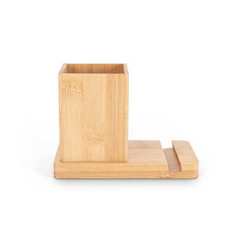 Stolni set od bambusa, idealan za organiziranje vašeg radnog prostora. Sastoji se od 1 utora za podršku vašem mobilnom uređaju i uklonjive čašice za organiziranje vaših kemijskih olovaka i drugog radnog materijala. Isporučuje se u poklon kutiji od kraft papira. Budući da je proizvod izrađen od prirodnih materijala, boja te rezultat ispisa mogu se razlikovati od proizvoda do proizvoda. Sklopljene dimenzije: 80 x 145 x 104 mm | Kućište: 80 x 145 x 33 mm