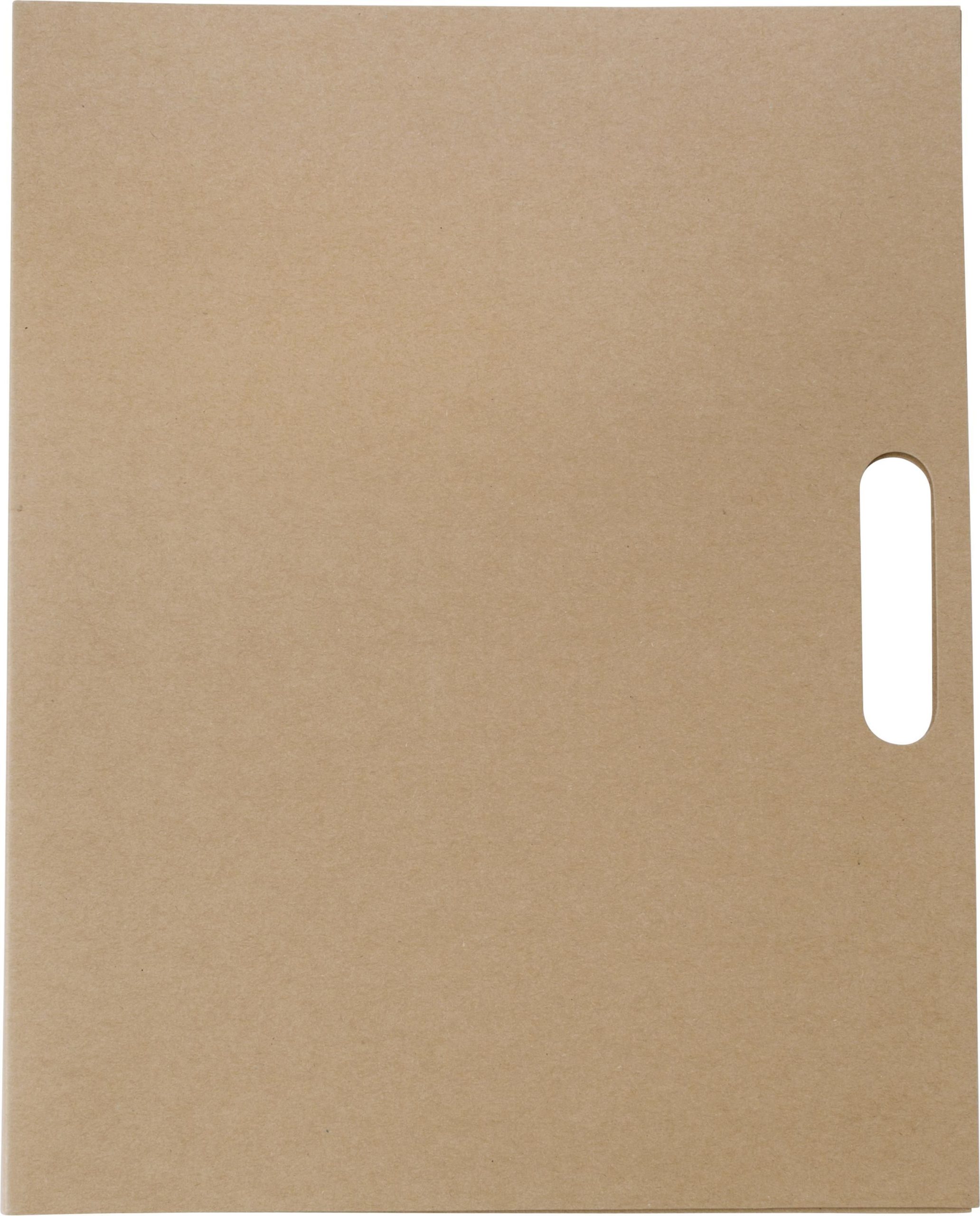Kartonska mapa s notesom s 25 liniranih stranica, ljepljivim papirićima u više boja (25 listova po boji) i omčom za kemijsku olovku s kartonskom plavom tintom.