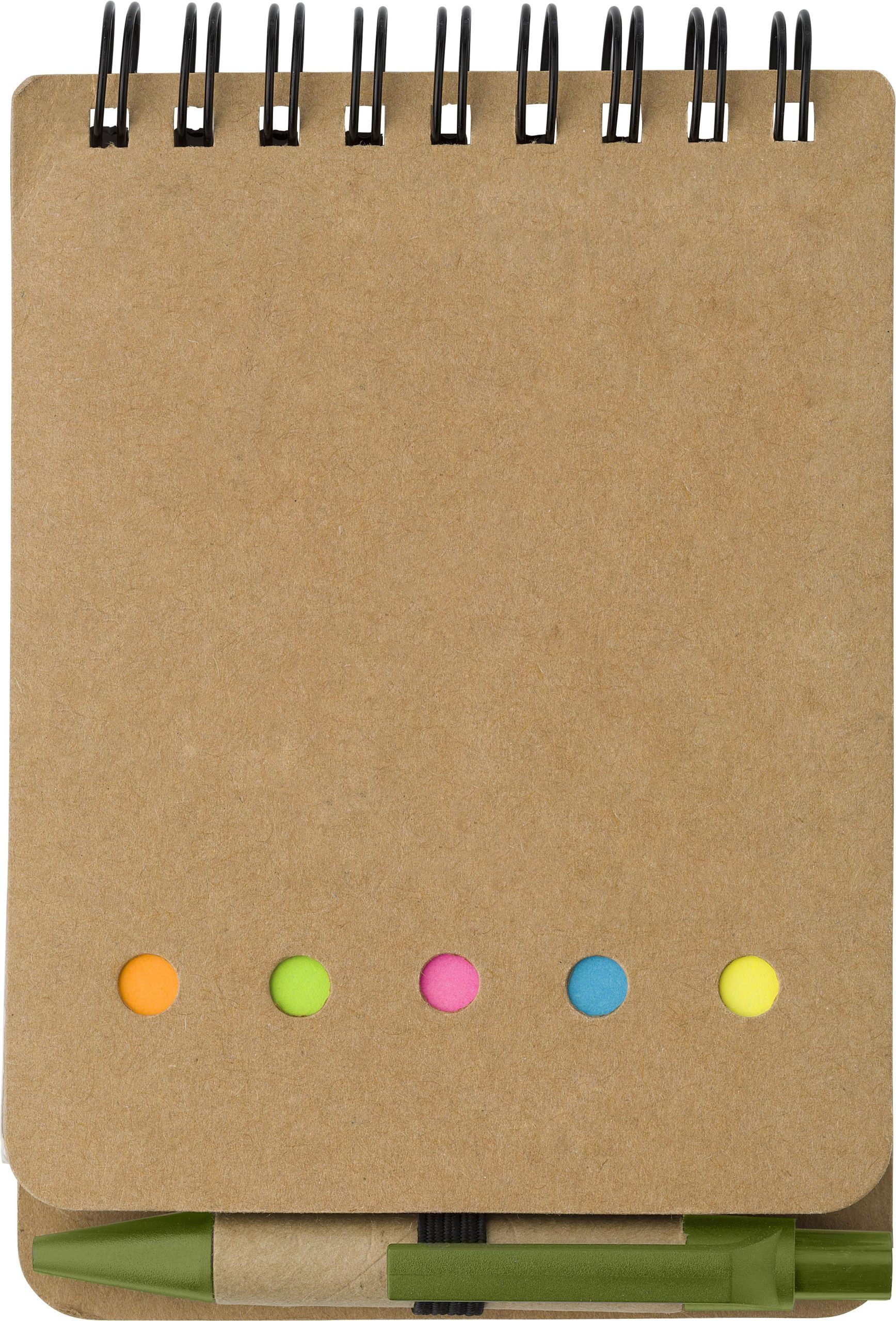 Kartonska, žičano uvezana knjižica s ukupno 150 ljepljivih papirića, blokom za bilješke sa 60 liniranih stranica, omčom za kemijsku olovku i kemijskom olovkom s crnom tintom.