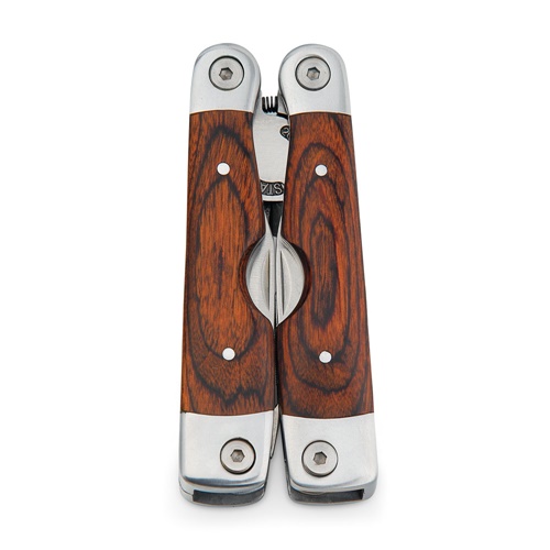 Sklopiva kliješta s višenamjenskim alatima od nehrđajućeg čelika i drva. Uključuje 20 funkcija: kliješta, odvijač, svrdla x10, kožno šilo, otvarač za boce, ravnalo, skidač ribljih ljuski i udica, PH odvijač, ravni odvijač, nož i vijak. Isporučuje se u poliesterskoj vrećici. 45 x 100 x 25 mm | Futrola: 65 x 140 x 30 mm