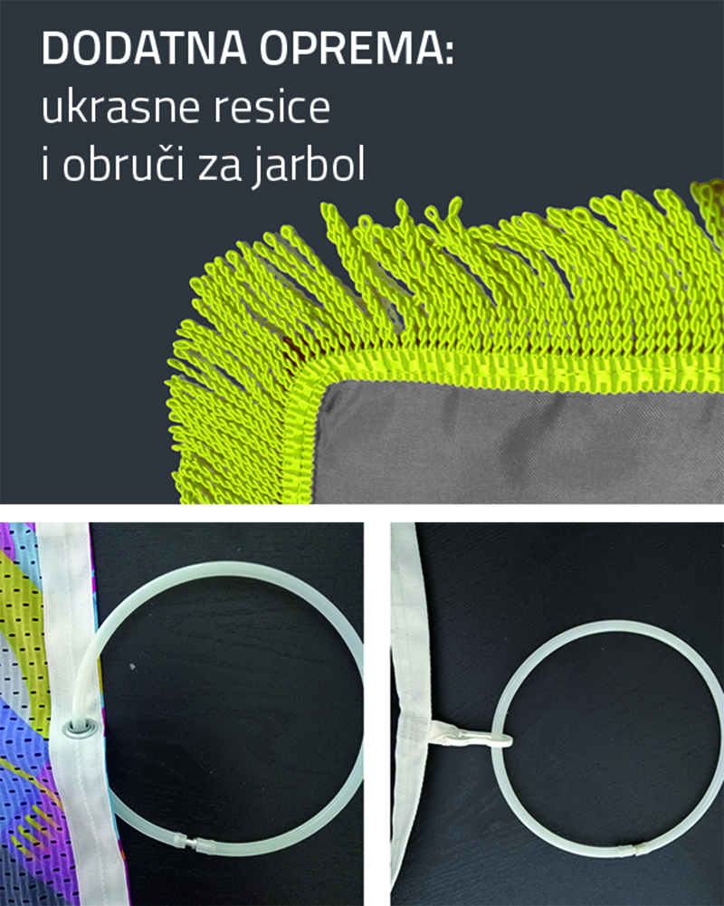 U navedene cijene je uključena konfekcija po izboru: ušivni tunel, metalne alkice, plastične kopčice… Osim gore navedenih dimenzija moguće je naručiti zastave u dimenziji prema vašim potrebama.